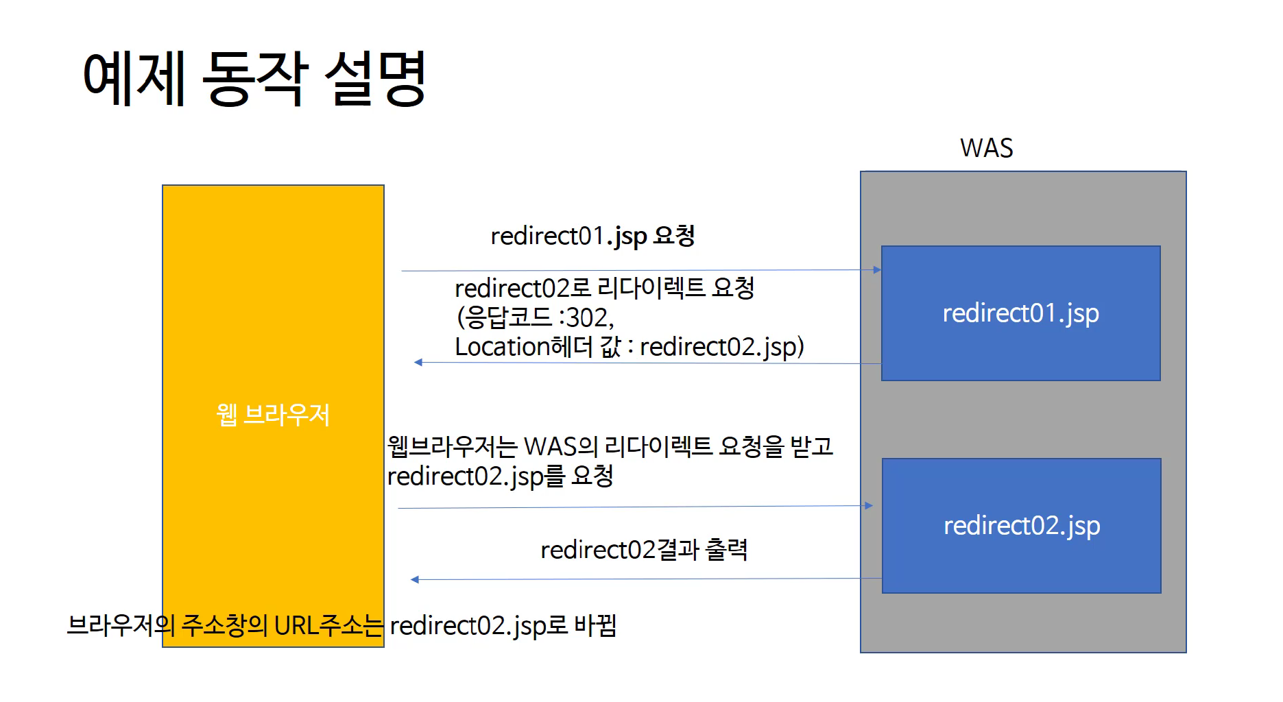 -> redir01.jsp 에서 응답response객체의 sendRedirect 메소드를 사용, redir02.jps로의 리다이렉트를 요청