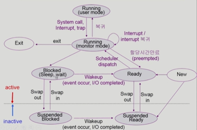 - Blocked ( wait / sleep ) : cpu 를 줘도 당장 instruction 을 수행할 수 없는 상태